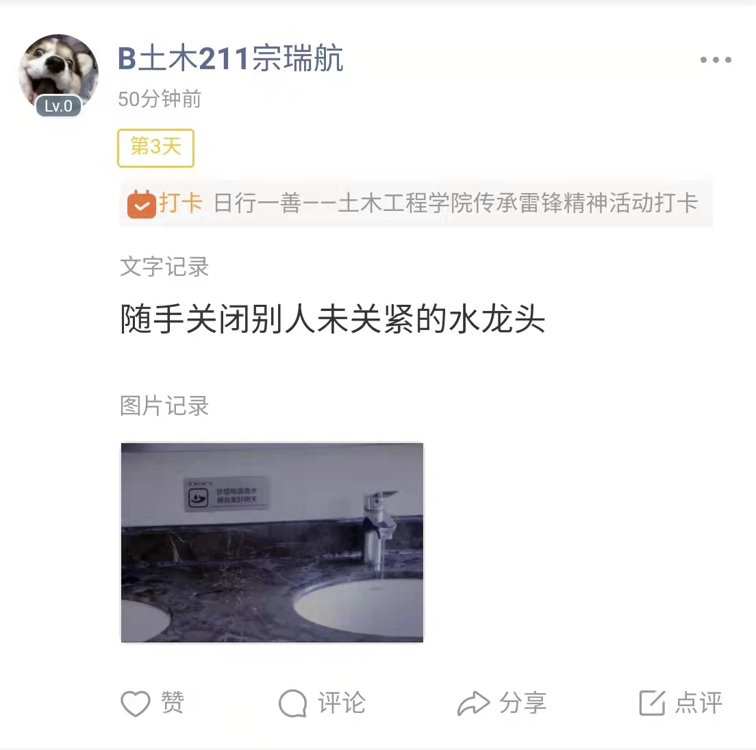 活动的第二阶段是“日行一善——土木工程学院传承雷锋精神”打卡活动,全院学生通过文字和图片形式分享自己每天做的学雷锋行为,进行每日善举打卡。同学们积极参与,每日在线上分享自己的光盘行动、清理宿舍、帮助室友等学雷锋行为。通过线上打卡方式,让雷锋精神“活”起来,同学们用实际行动促进良好校园文明风气的形成和发展,在工学院留下“志愿雷锋“的足迹。