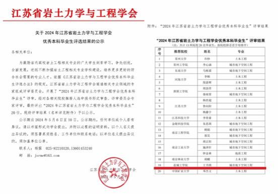 日前,江苏省岩土力学与工程学会公布了2024年江苏省岩土力学与工程学会优秀本科毕业生名单,我校土木工程学院城市地下空间工程专业B城市201班王书琪同学获此殊荣。