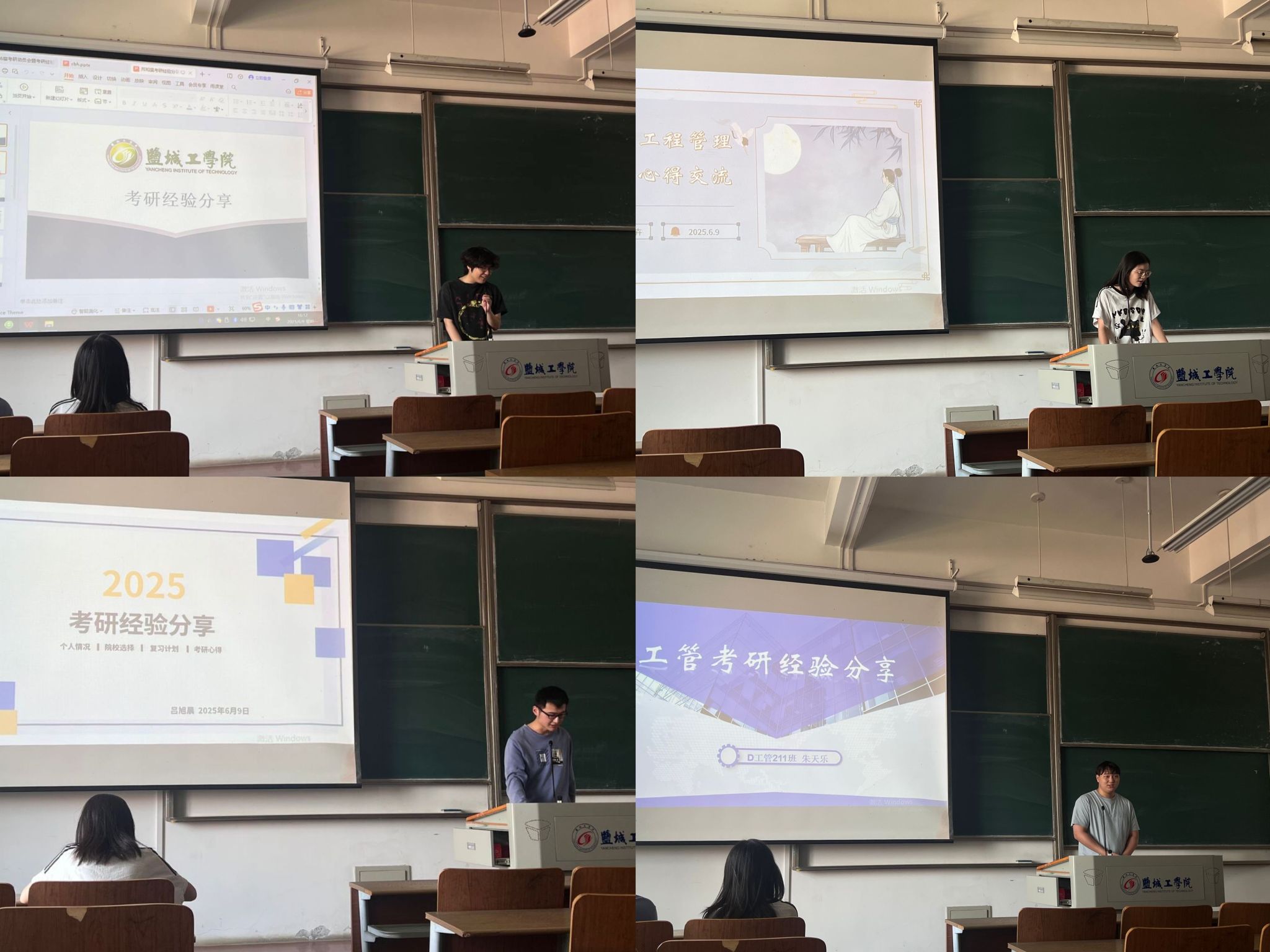 随后,2025届考研上岸苏州科技大学的邢知昊、西安建筑科技大学的陈柏卉、南京工业大学的吕旭晨、中国矿业大学的朱天乐依次上台分享经验。他们结合自身的考研经历,围绕考研动机、院校选择、资料准备、复习计划、时间管理等方面进行了详细的介绍。在互动环节,同学们就自己关心的问题与学长学姐们进行了热烈的交流。