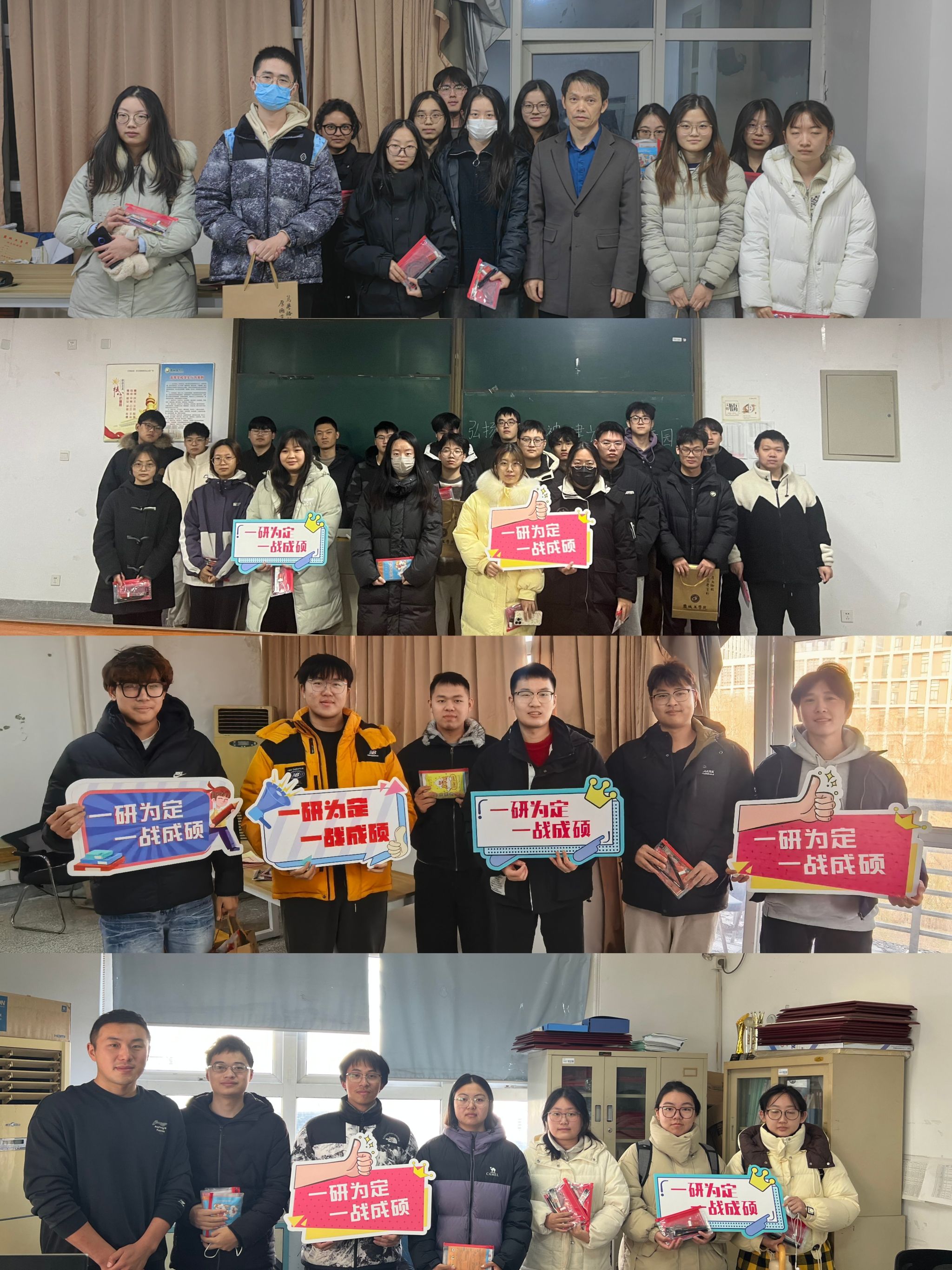 活动现场暖意融融,辅导员老师们细致询问考研学子们的复习进度、备考难点与生活需求,高度肯定了大家不畏艰辛、潜心向学的拼搏精神。针对冲刺阶段的备考关键,辅导员老师们叮嘱学子要科学规划时间,聚焦重点难点实现精准突破,同时注重劳逸结合,保持规律作息与积极心态,以饱满精力迎战考试。慰问中,学院为每位考研学子送上精心筹备的“暖心加油包”,内含寓意“金榜题名”的文具套装、抵御严寒的暖宝宝及定制的加油鼓劲书签,每一份礼物都承载着学院的深切关怀与美好期许。