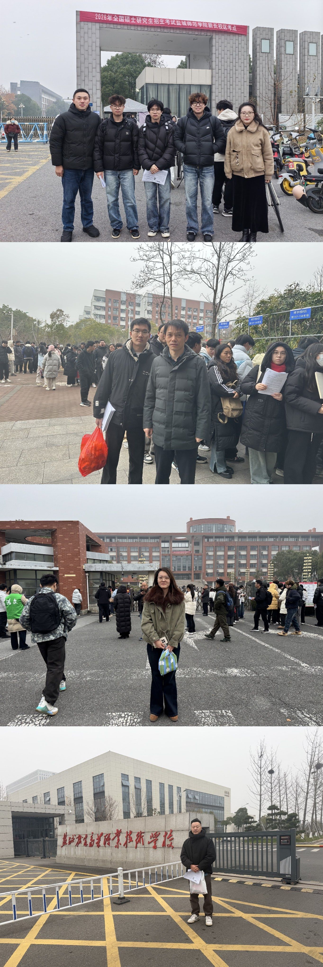 毕业班辅导员早早在盐城工学院希望大道校区、盐城师范学院新长校区、盐城幼儿师范高等专科学校学海路校区、盐城机电高等职业技术学校等四个考点现场门口,为学子们加油鼓劲,叮嘱大家调整心态、仔细审题、从容应考。学院还为考研学生准备了暖宝宝贴、巧克力、面包等实用贴心的应考物资。