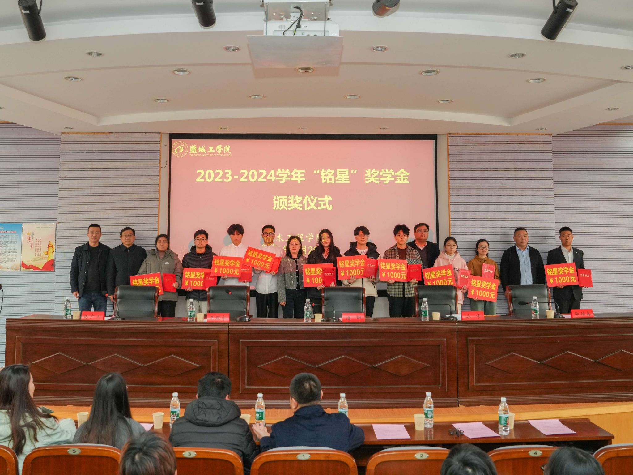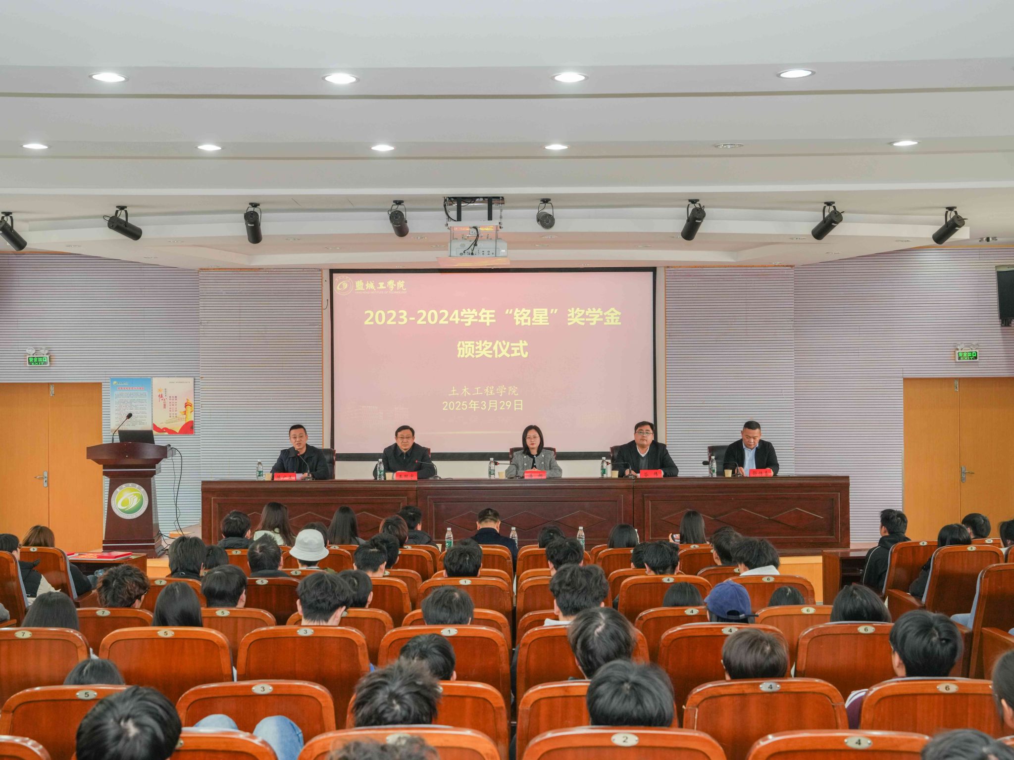 为进一步加强学风建设,发挥优秀学子榜样示范作用,3月29日下午,土木工程学院联合“砼心苑”一站式学生社区在土木馆报告厅举行2023-2024学年“铭星”奖学金颁奖仪式。江苏铭星供水设备有限公司董事会秘书潘娜、人事总监邵传喜、土木工程学院党委书记谷伟、院长王照宇、党委副书记陈广正在主席台就坐并为获奖同学颁奖。江苏铭星供水设备有限公司人事经理吕慧、学院给排水专业教师代表、辅导员代表、获奖同学、给排水专业2022-2024级全体学生近200人参加。