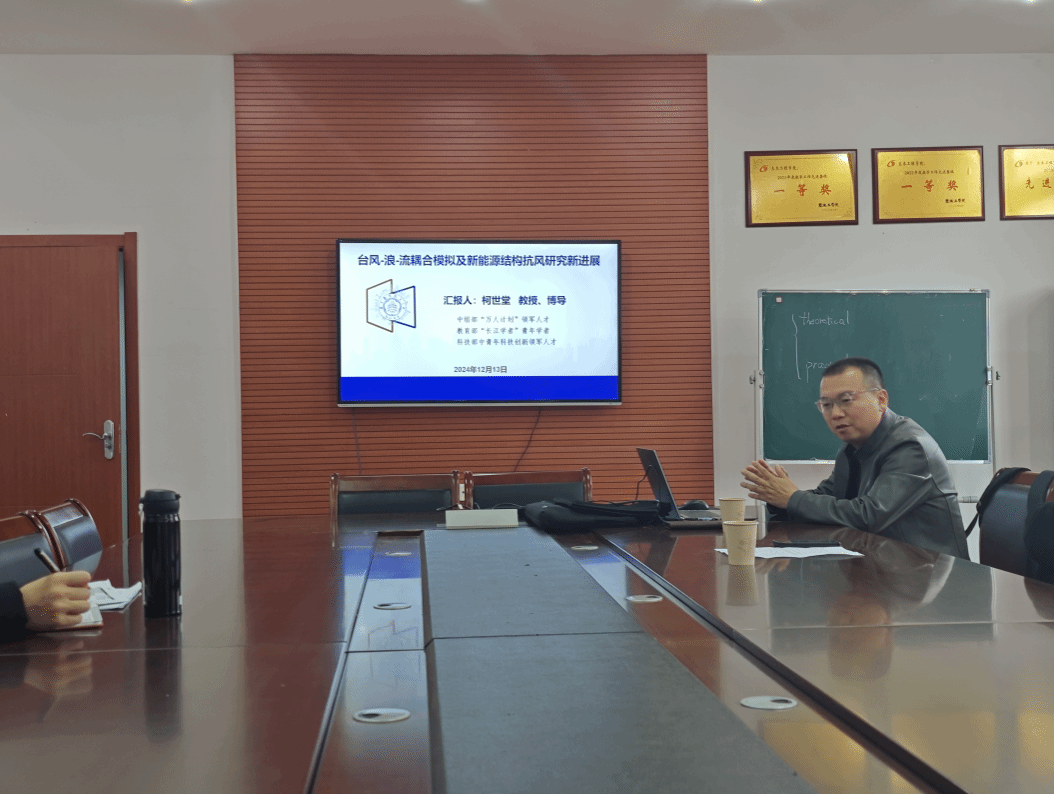 会上,柯教授介绍了其所在团队的主要研究方向,分享了在台风-浪-流耦合模拟领域的最新研究成果,以及新能源结构在极端气候条件下的抗风性能研究的新进展,报告涵盖了理论分析、数值模拟和实验验证等多个方面,详细介绍了研究团队的科研成果,并就专业相关问题与参会教师进行了深入的交流与讨论。此次报告会对学院教师科研具有方向指引、知识更新、方法借鉴、合作交流等多方面的积极作用,同时也加强了院校间的科研合作,有助于学院培养适应行业发展方向的土木工程专业人才。
