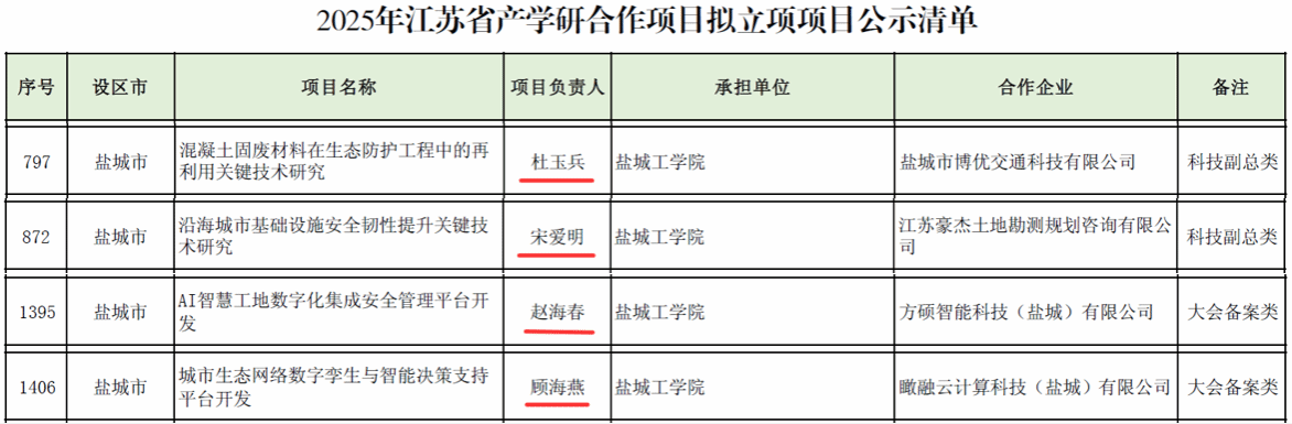 杜玉兵教授申报的“混凝土固废材料在生态防护工程中的再利用关键技术研究”、宋爱明副教授申报的“沿海城市基础设施安全韧性提升关键技术研究”、赵海春老师申报的“AI智慧工地数字化集成安全管理平台开发”、顾海燕老师申报的“城市生态网络数字孪生与智能决策支持平台开发”等4个项目成功获批立项。其中有3个项目深度聚焦城市更新领域,彰显学院在推动科研方向朝绿色低碳与城市可持续发展转型中的显著成效。
