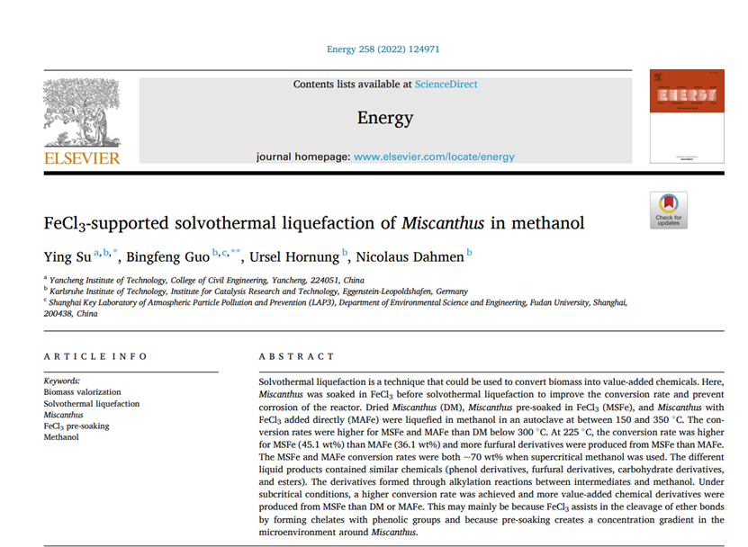 盐城工学院土木工程学院给排水科学与工程专业苏瑛副教授作为第一作者和通讯作者在国际期刊《Energy》(JCR分区1区,中科院2021升级版分区:(大类)工程技术1区TOP期刊,IF= 8.857)上发表了题为《FeCl3-supported solvothermal liquefaction of Miscanthus in methanol》(Volume 258, 1 November 2022, 124971)的文章。