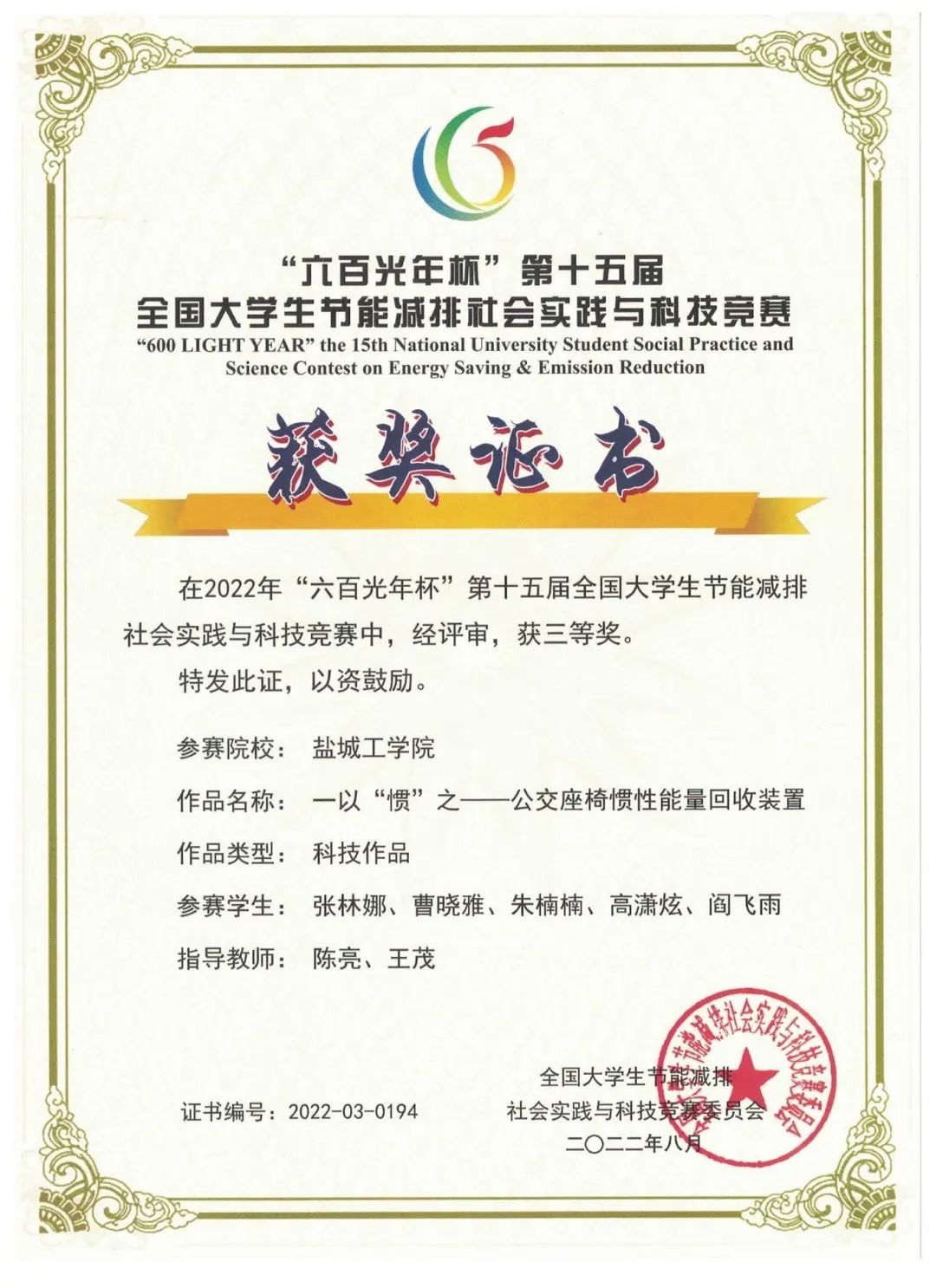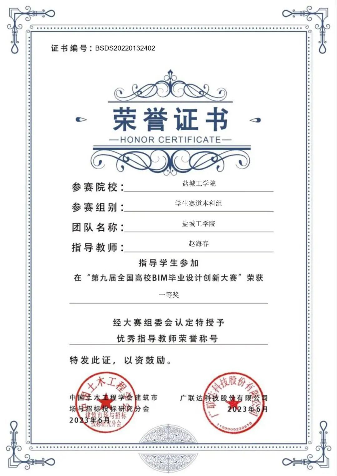 获奖情况:获校一等奖学金2次、二等奖学金6次,2021年、2022年、2023年校级三好学生,2022年度校百佳青年,2022年度土木工程学院十佳“土木好青年”,2023年盐城市“黄海明珠”大学生奖学金,2022年、2023年全国大学生英语竞赛(NECCS)国家二等奖,2023年第九届全国高校BIM毕业设计大赛一等奖、2024年第十届全国高校BIM毕业设计大赛三等奖,2022年江苏省工程管理创新创业与实践竞赛二等奖,2021年江苏省高等学校第十八届高等数学竞赛二等奖。