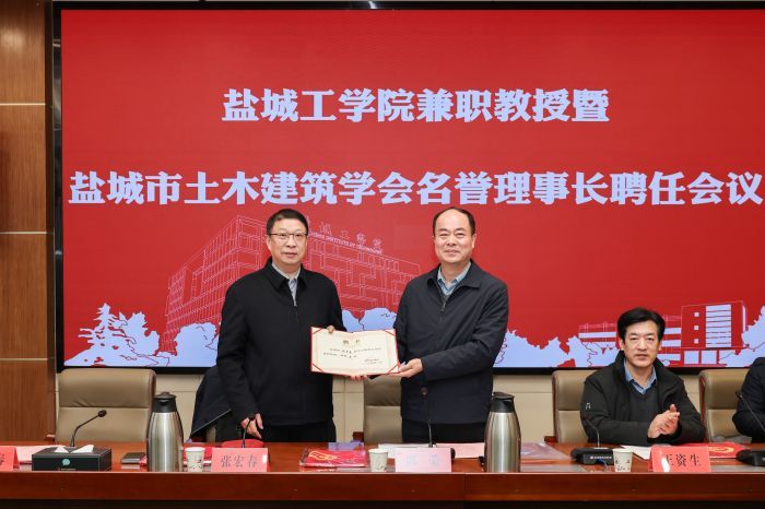 仪式上,邵荣为张宏春颁发盐城市土木建筑学会名誉理事长和盐城工学院兼职教授聘书,并介绍了学校在学科建设、专业建设、科技服务、人才培养等方面取得的成绩和特色。他指出,聘请张局长担任土木建筑学会名誉理事长及学校兼职教授,对盐工、土木建筑学会和土木学院都具有重要意义,这将推动盐工事业和学会发展实现新跨越,助力土木学院人才培养再上新台阶、促进校地融合协同再创新成果。