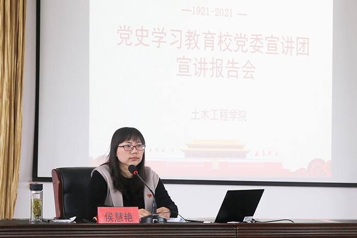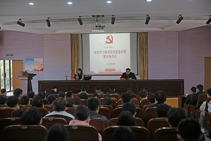 4月20日下午,我校党史学习教育校内首场宣讲报告会在土木工程馆报告厅举行。校党委党史学习教育宣讲团成员、马克思主义学院侯慧艳博士为土木学院学生党员、入党积极分子、学生干部150余人作题为《学党史、强信念、奋力开启全面建设社会主义现代化国家新征程》的党史专题宣讲报告。校党委副书记、党史学习教育领导小组常务副组长薛浩,党委常委、组织部部长、党史学习教育领导小组办公室主任倪自银,党委宣传部、马克思主义学院负责人,校内宣讲团成员等现场观摩。报告会由土木学院党委负责人主持。