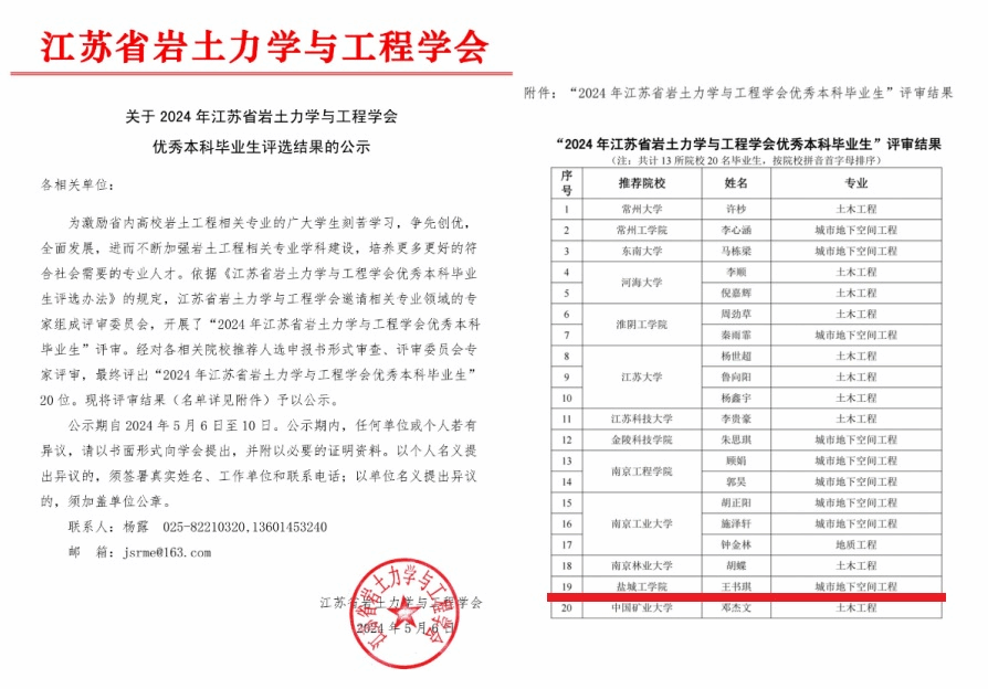 日前,江苏省岩土力学与工程学会公布了2024年江苏省岩土力学与工程学会优秀本科毕业生名单,我校土木工程学院城市地下空间工程专业B城市201班王书琪同学获此殊荣。