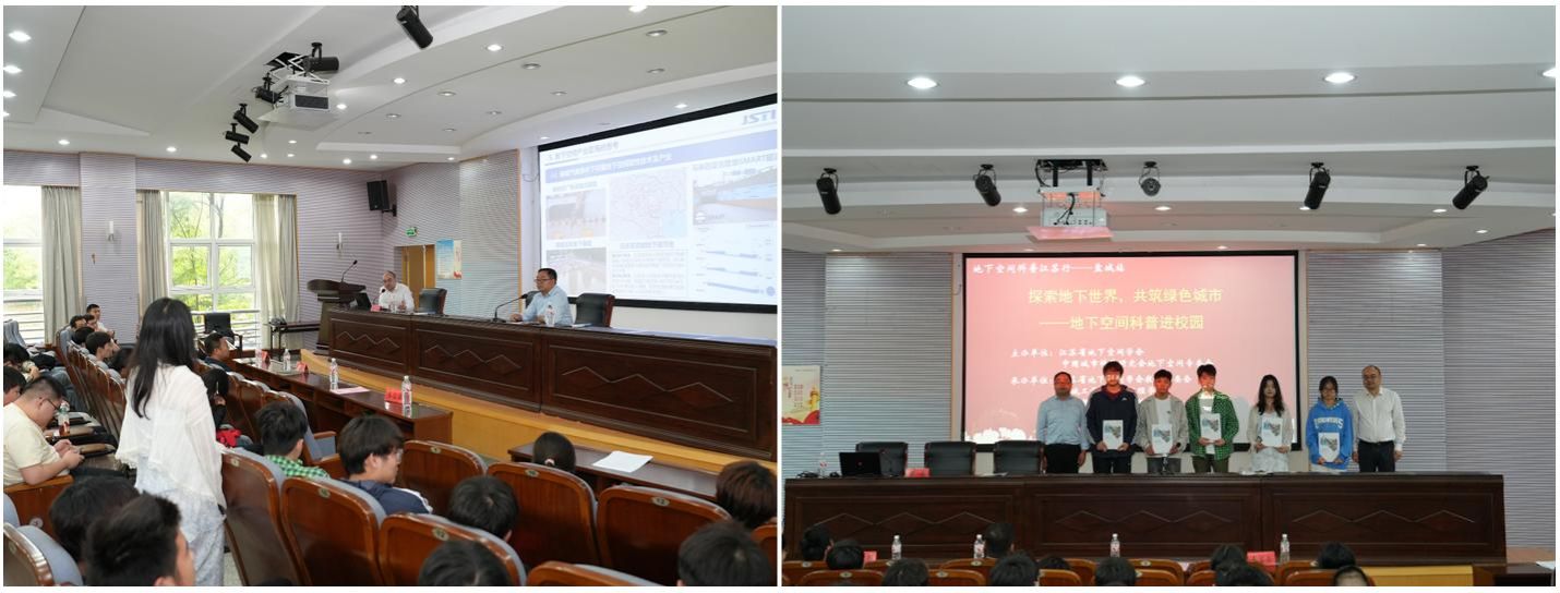 活动第一阶段,江苏省地下空间学会与我校土木工程学院举行了共建科普教育基地签约、揭牌仪式。仪式后,李奥介绍了学会科普工作情况。黄俊为我校城市地下空间工程专业学生作主题为《思变向新 争做存量时代基础设施的“地下工作者”》的报告。报告中,黄俊围绕国家战略科学技术需求,介绍了地下空间历史发展的经验,分享了他20多年来地下空间行业经历以及对地下空间产业的理解和思考。报告结束后,黄俊还与学生进行了互动交流,鼓励同学们学好专业知识,参与到地下空间开放与利用中来,并向我校学生赠送了《江苏省地下空间发展报告2023》蓝皮书。黄俊一行参观了土木工程学院地下空间模型和模型竞赛作品。