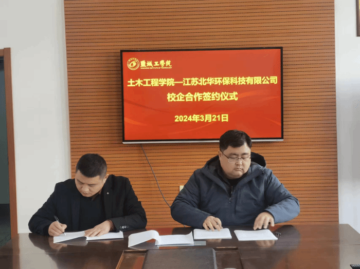 3月21日上午,土木工程学院在希望大道校区土木馆二楼会议室举行校企合作签约仪式。学院党委书记谷伟,江苏北华环保科技有限公司法人代表张腾飞、滨海沿海工业园区污水处理厂厂长陈虎,土木工程学院市政工程系和学生科部分老师参加。签约仪式由市政工程系主任甄树聪主持。