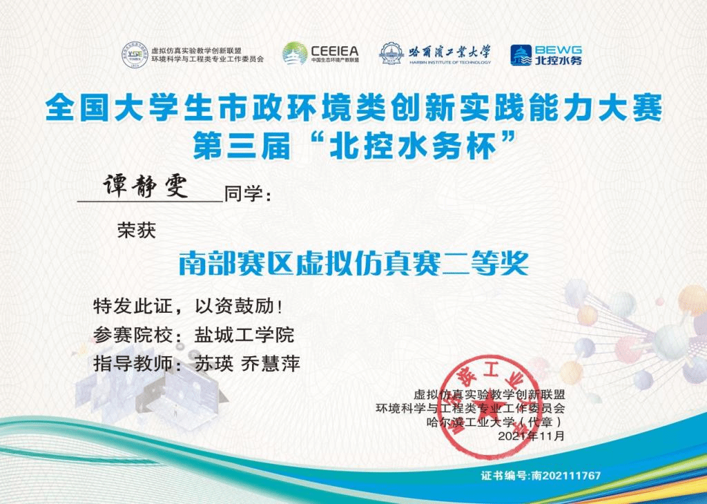 近日,全国大学生市政环境类创新实践能力第三届“北控水务杯”大赛举行,由土木工程学院给排水科学与工程专业甄树聪担任领队,苏瑛、乔慧萍、廖钰冰、王文豪等老师指导的三支参赛队伍代表我校首次参加本次大赛,获二等奖1项、三等奖8项。