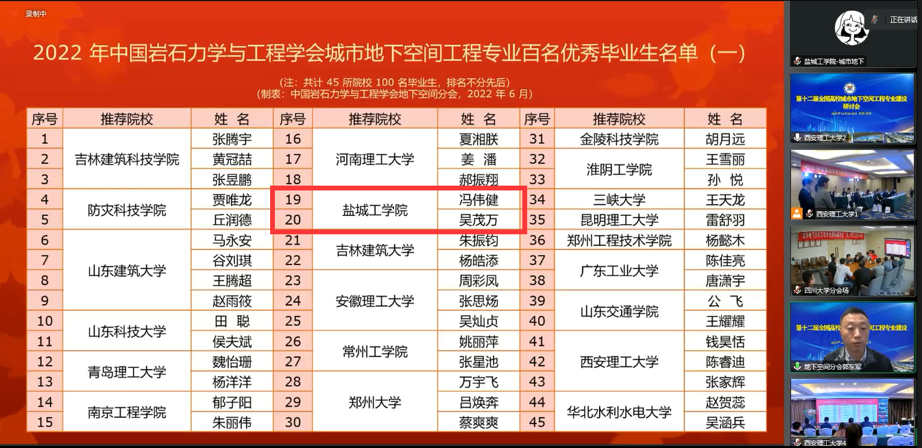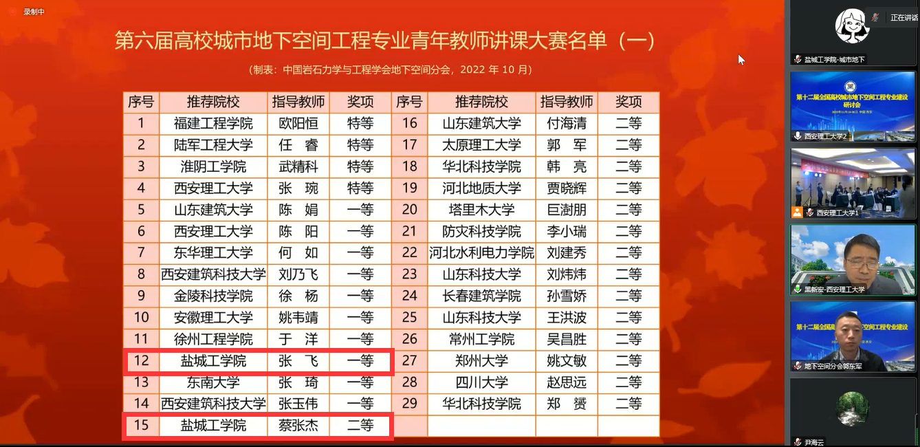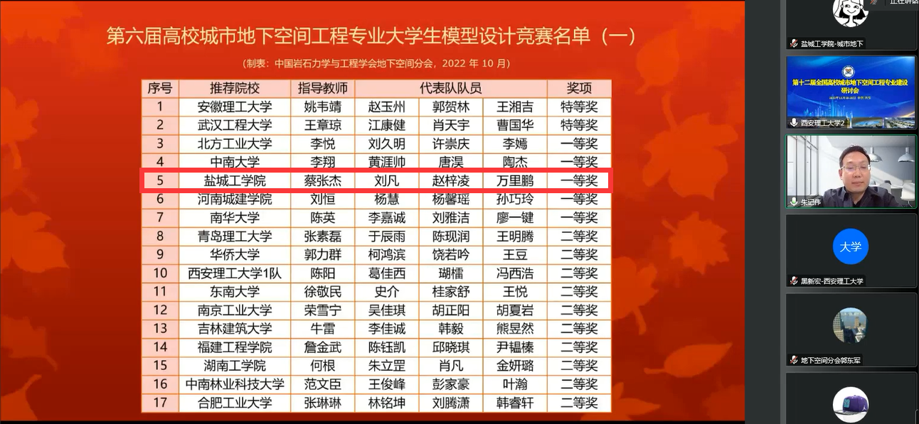 研讨会闭幕式上,大赛组委会宣布了全国城市地下空间工程专业2022届优秀毕业生名单、第六届城市地下空间工程专业青年教师讲课比赛获奖名单、第六届城市地下空间工程专业大学生模型设计大赛获奖名单。我校城市地下空间工程专业18级冯伟健、吴茂万两位同学获全国优秀毕业生,张飞、蔡张杰老师分获讲课比赛一、二等奖,城市地下空间工程专业刘凡、赵梓凌、万里鹏三位同学组成的盐城工学院代表队(指导老师:蔡张杰)获大学生模型设计竞赛一等奖。