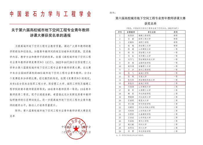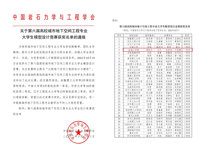 两项赛事由教育部高等学校土木工程专业教学指导分委员会、中国岩石力学与工程学会主办,是城市地下空间工程专业权威赛事,其中,青年教师讲课大赛为中国高教学会全国高校教师教学竞赛排行榜赛事。通过此次大赛,加强了我校与国内兄弟高校的交流和联系,增强了学生的创新实践能力和团队协作能力,也是对我校教育教学水平的充分认可,进一步提升了我校的影响力和知名度。