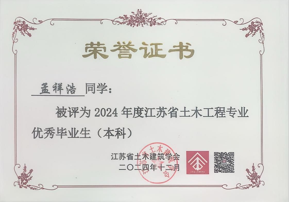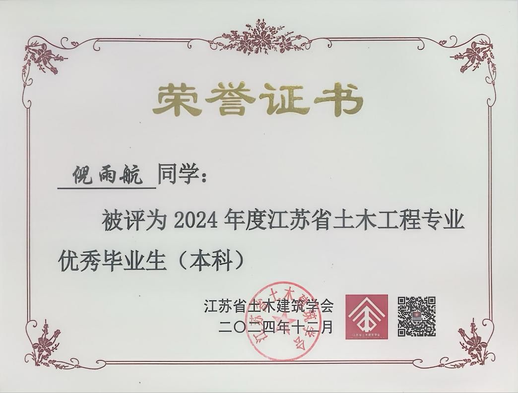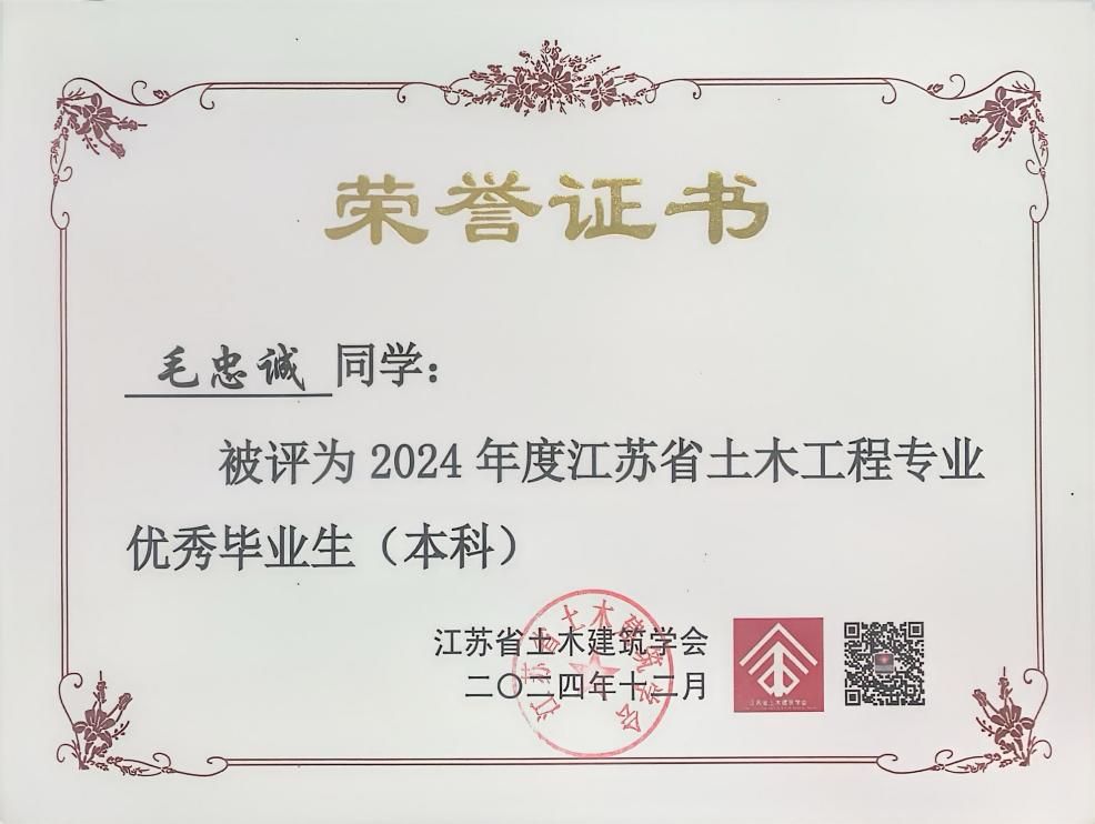 近日,从江苏省土木建筑学会传来喜讯,我院2024届土木工程专业本科毕业生毛忠诚、孟祥浩、倪宇航同学荣获“江苏省土木工程专业优秀毕业生(本科)”称号。