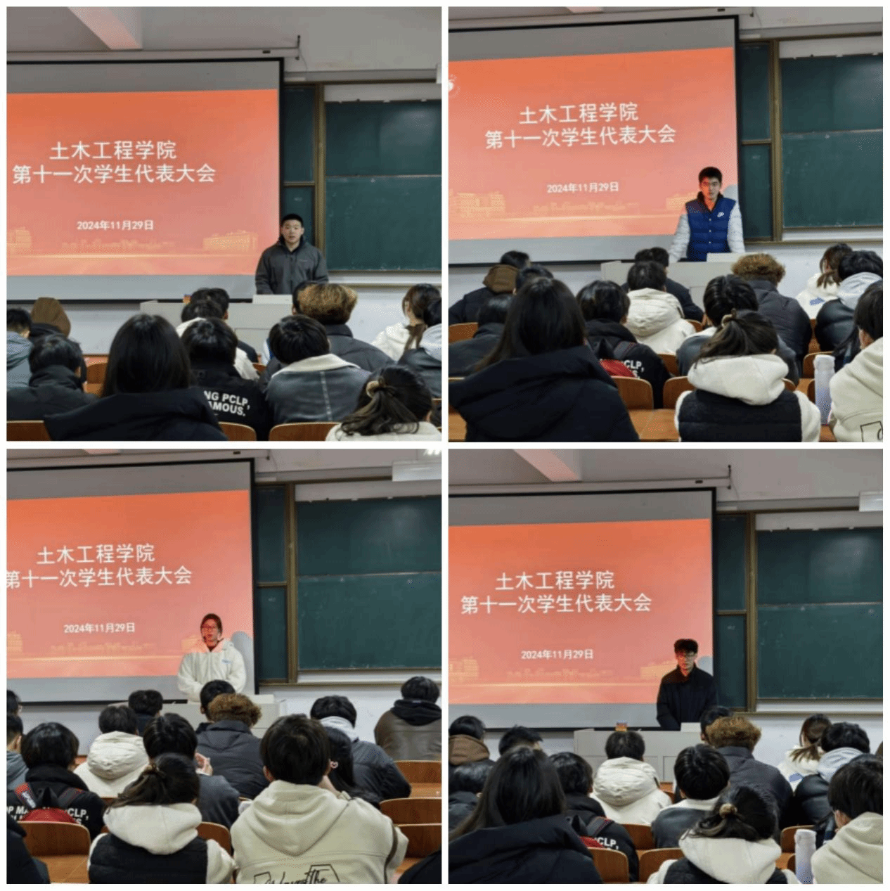 11月29日,土木工程学院第十一次学生代表大会在博学楼D213召开。2022、2023、2024级共计150余名学生代表参加本次大会。