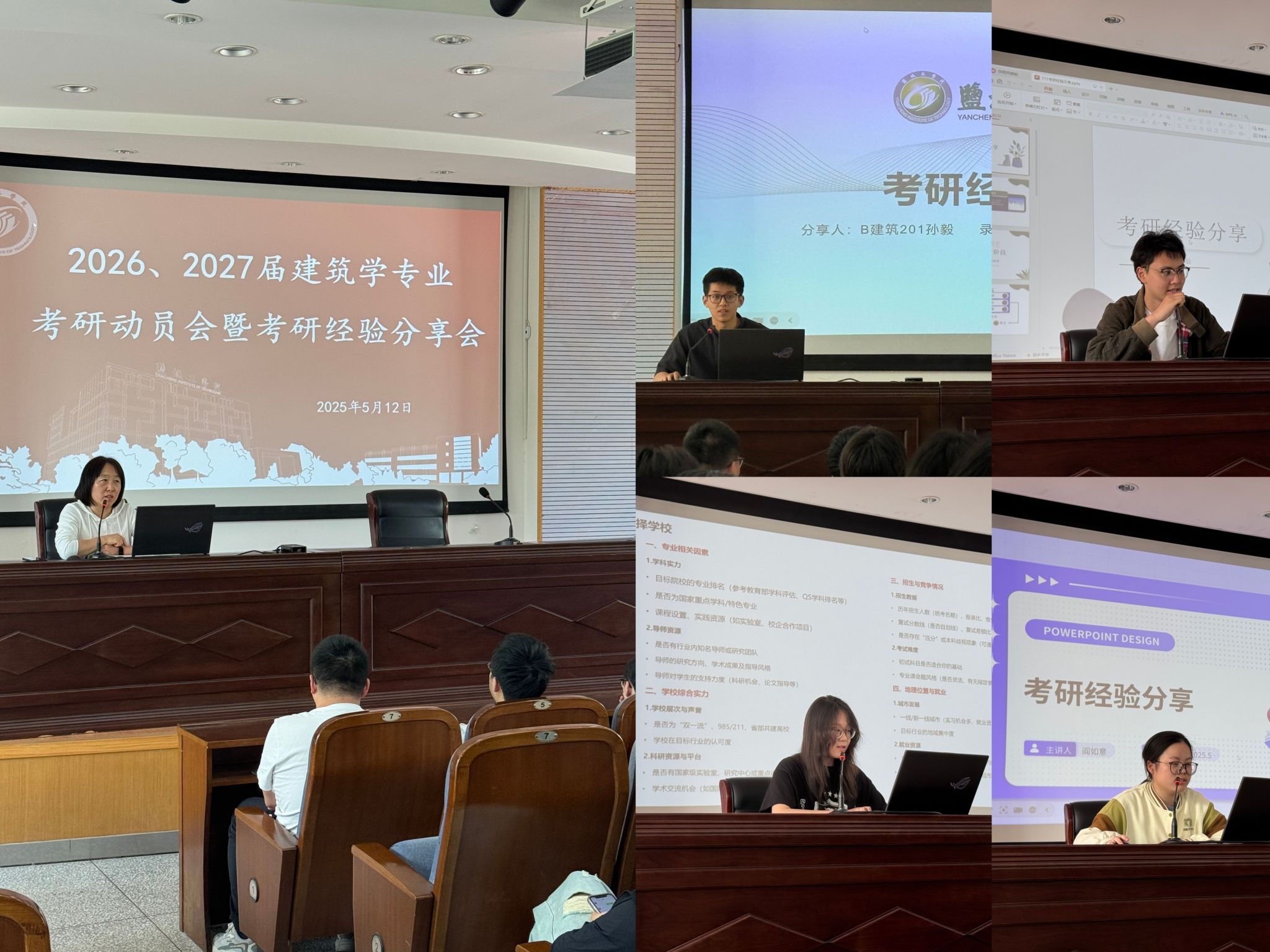 为进一步加强学风建设,激发学生的考研热情,帮助同学们深入了解考研形势、掌握考研技巧,土木工程学院联合“砼心苑”一站式学生社区于5月12日下午在土木馆报告厅举办2026、2027届建筑学专业考研动员会暨考研经验分享会。建筑系主任王玉娟,2026、2027届建筑学专业辅导员、全体学生参加。