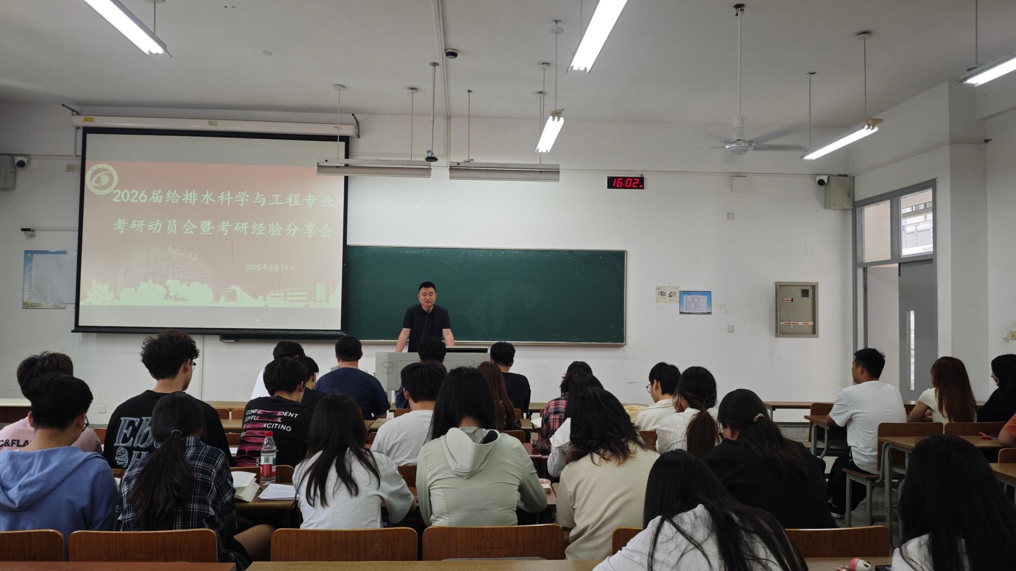 为进一步激发学生考研热情,提升备考效率与信心,帮助同学们正确了解考研形势与专业前景,5月19日下午,土木工程学院联合“砼心苑”一站式学生社区在博学楼1J1A209教室举办2026届给排水科学与工程专业考研动员会暨考研经验分享会。市政工程系主任方学友、给排水科学与工程专业2025届考研上岸学生代表、B给排水221-222班辅导员张春丽及全体学生60余人参加。会议由辅导员张春丽主持。