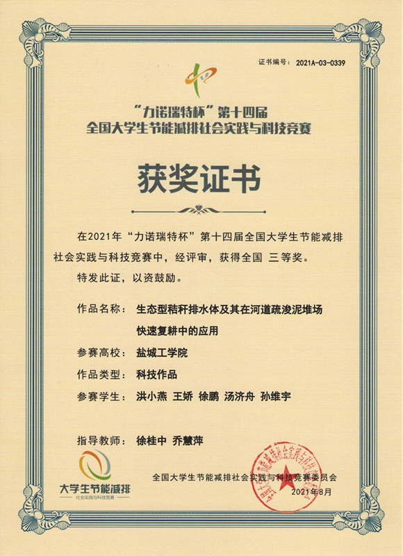 8月28日,由教育部高等学校能源动力专业教学指导委员会指导、全国大学生节能减排社会实践与科技竞赛委员会主办、山东大学承办的第十四届全国大学生节能减排社会实践与科技竞赛决赛在济南落下帷幕。我院徐桂中、乔慧萍老师指导,洪小燕、王娇、徐鹏、汤济舟、孙维宇同学完成的《生态型秸秆排水体及其在河道疏浚泥堆场快速复耕中的应用》荣获国家级二等奖。