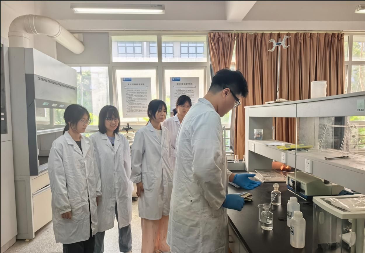 杜玉兵讲解并演示了灭火毯使用方法,系统介绍了灭火器类型、适用场景及“拔销、握管、瞄准根部、压把喷射”的标准操作流程,学生随后依次进行了灭火器实操。随后,管理员廖钰冰重点培训强酸等危化品安全使用规范及泄漏应急处置,强调皮肤、眼睛接触试剂后须立即用大量流动清水持续冲洗,并现场演示了洗眼器的快速正确使用方法。