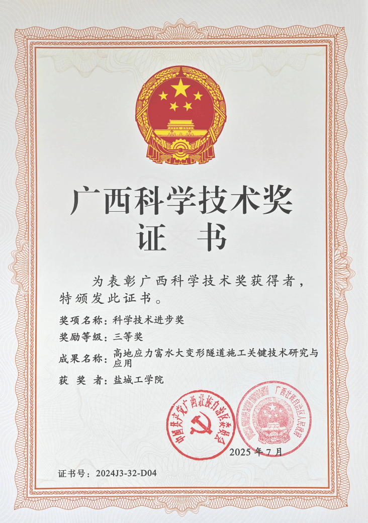 近日,《中共广西壮族自治区委员会广西壮族自治区人民政府关于2024年度广西科学技术奖励的决定》(桂委〔2025〕273号)发布,揭晓了2024年度广西科学技术奖奖励名单。盐城工学院联合中铁二十五局集团第四工程有限公司、中铁二十五局集团有限公司、西安建筑科技大学、成兰铁路有限责任公司、中铁建北部湾建设投资有限公司等单位共同完成的《高地应力富水大变形隧道施工关键技术研究与应用》科研课题,荣获“2024年广西科学技术三等奖”,土木工程学院程昀博士作为主要完成人(2/10)为该项目作出重要贡献。
