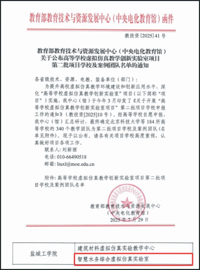 近日,教育部教育技术与资源发展中心(中央电化教育馆)正式公布高等学校虚拟仿真教学创新实验室项目第二批入选学校及案例团队名单,我院王照宇教授团队申报的“智慧水务综合虚拟仿真实验室”成功获批。