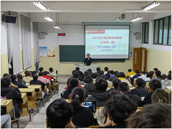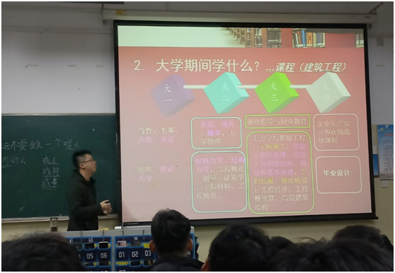 朱华告诉B土木211、B土木213-214班同学们,到了大学阶段需要做好三点:第一要养成良好的习惯,第二要管理好时间,第三要克服自己的惰性。朱华介绍了该专业的就业前景,同时也为同学们介绍了在大学四年期间需要学习的专业课,还现场播放了往年土木专业的校友们录制的视频,让同学们更清楚地了解到土木专业以后的就业方向及前景。最后朱华叮嘱同学们在大学里需要学会读书、学会独立,学会处理好知识和能力的关系,学会在孤独的日子享受孤独。