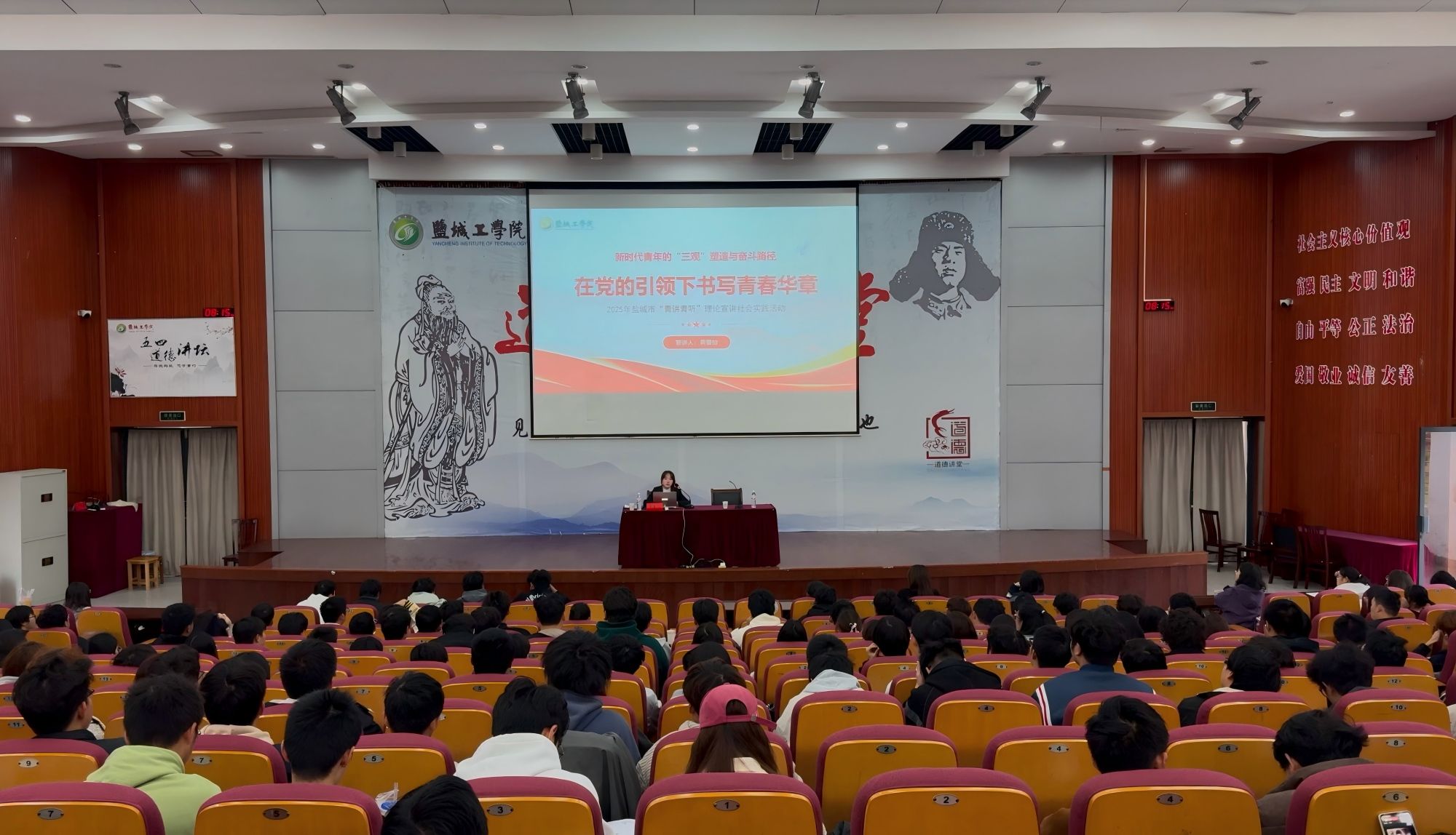 黄馨怡就2025年盐城市“青讲青听”理论宣讲社会实践活动作题为“在党的引领下书写青春华章——新时代青年的‘三观’塑造与奋斗路径”的理论宣讲。她以王海纹、徐秀娟等英烈事迹为切入点,深刻阐释了新时代青年应有的世界观、人生观与价值观,呼吁全体同学坚定理想信念,争当追光前行的奋斗者;潜心学习实践,练就过硬本领;勇立时代潮头,激发创新思维,让青春在为祖国、为人民的不懈奋斗中绽放绚丽光彩。