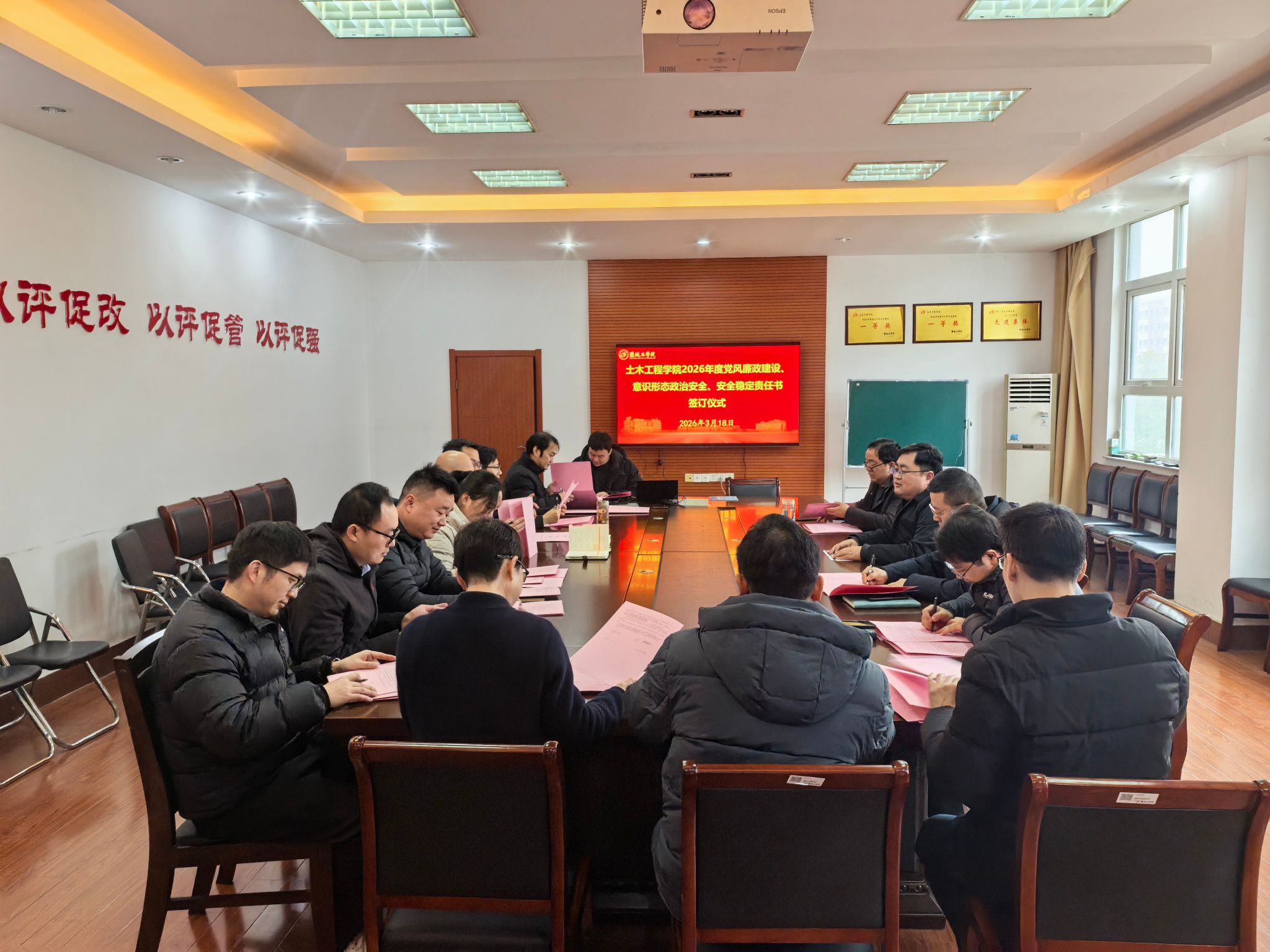 为进一步确保学院党风廉政建设、意识形态工作、安全稳定工作落实到位,3月18日下午,我院在土木馆A206会议室举行2026年度党风廉政建设责任书、意识形态工作责任书和安全稳定责任书签订仪式。全体院领导,各科室负责人、党支部书记、专业系和实验中心主任参加会议。会议由学院党委书记谷伟主持。