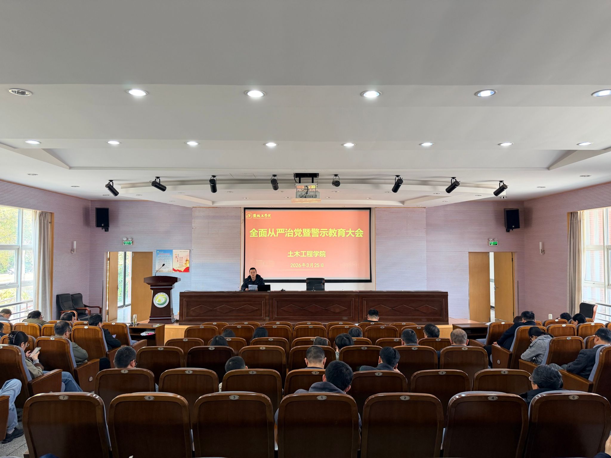 3月25日下午,土木工程学院在土木馆报告厅召开2026年全面从严治党暨警示教育大会,深入学习贯彻习近平总书记在二十届中央纪委五次全会上的重要讲话精神,并进一步传达了校党委书记周如军在学校2026年全面从严治党工作大会和在党的建设工作领导小组(扩大)会议部署树立和践行正确政绩观学习教育工作时的讲话精神。会议由院党委书记谷伟主持,学院全体教职工参加。