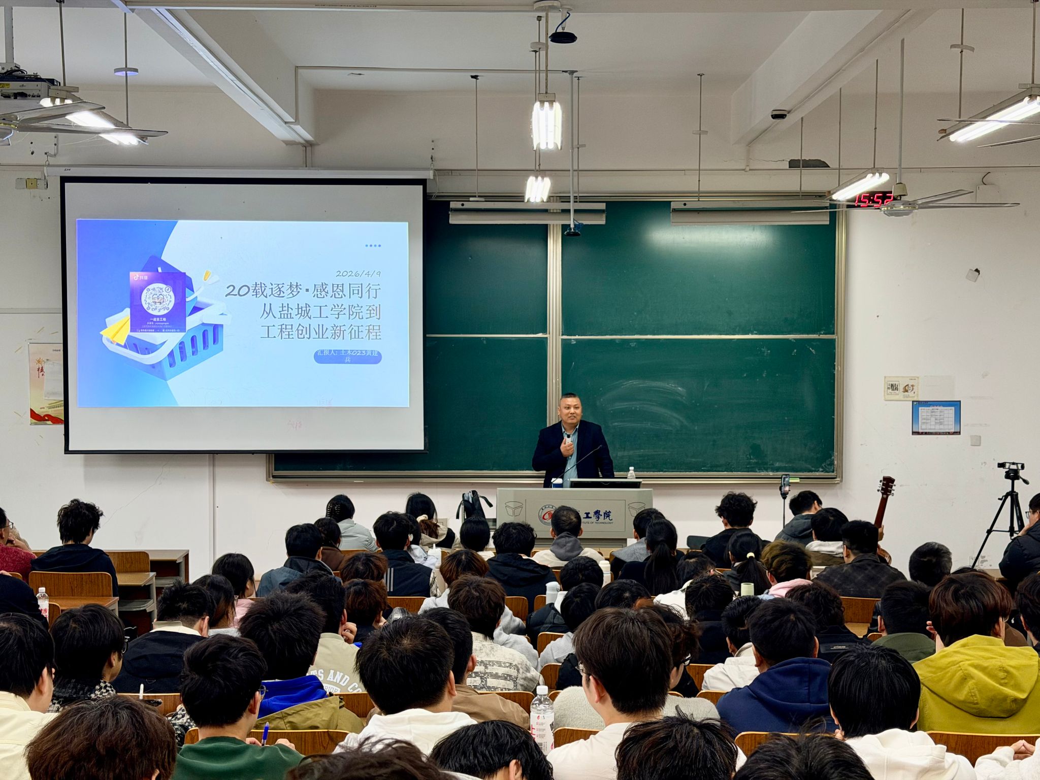 课堂上,黄建兵结合自身二十载创业历程,用朴实真挚的语言、跌宕起伏的经历,生动诠释了“事虽难,做则必成”的深刻内涵。分享中,黄建兵结合行业发展趋势,分享了自己的创业心得与职业感悟。他谈到,土木行业充满机遇与挑战,唯有脚踏实地、精益求精,才能在行业浪潮中站稳脚跟;同时,他鼓励学弟学妹们要珍惜大学时光,扎实学好专业知识,筑牢职业发展根基,既要勇于尝试新事物、打破思维定势,像自己利用新媒体搭建工程资源共享平台、拓展业务边界那样主动创新,也要坚守初心、持之以恒,在成长路上不惧挫折、迎难而上。
