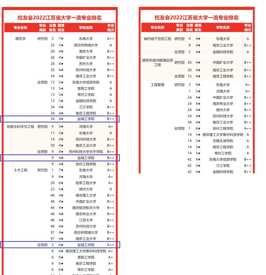 近日,校友会2022中国大学一流专业排名正式发布,我院土木工程、给排水科学与工程、建筑学等3个专业进入榜单,其中土木工程专业为应用型6星专业,在应用型专业排名中,位列全国第2名,江苏省第1名,省内唯一一个A++档次专业,凸显了我院土木工程专业的引领地位;给排水科学与工程和建筑学专业均为为应用型4星专业,分列全国第9和第34名,均为B++档次,在国内应用型专业中表现出较强的竞争力。