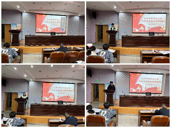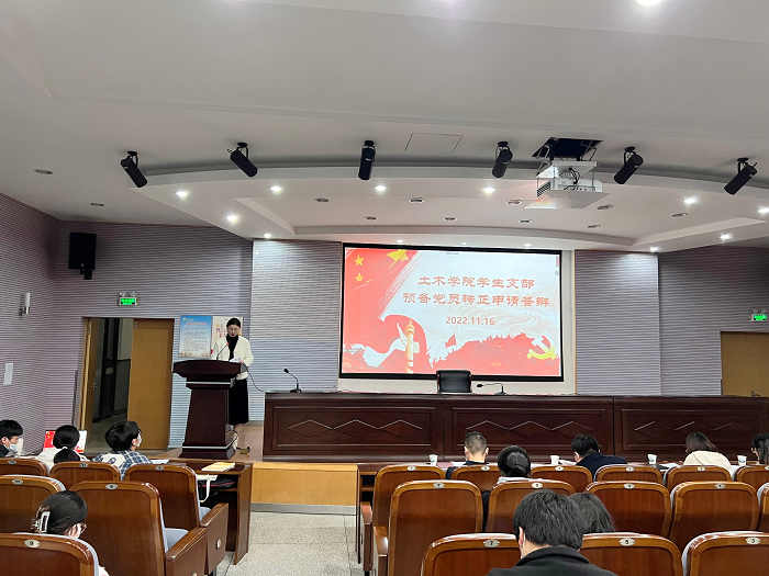 11月16日晚18:30,土木工程学院在希望大道校区土木馆报告厅召开预备党员转正答辩会。学院党委书记谷伟,副书记陈广正,学生党支部书记、支部委员及支部教师党员出席本次答辩会并担任答辩评委,26名预备党员参加答辩。