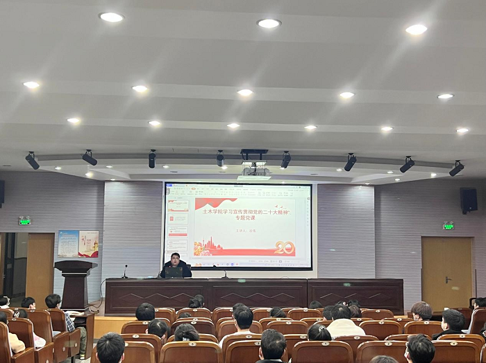 为推动学院全体学生党员同志深入学习宣传贯彻党的二十大精神,11月16日晚18:30在希望大道校区土木馆报告厅,土木工程学院开展了“学习贯彻党的二十大精神”专题党课。此次专题党课由学院党委书记谷伟主讲,副书记陈广正、团委副书记徐佳、全体专职辅导员和全体学生党员参加。