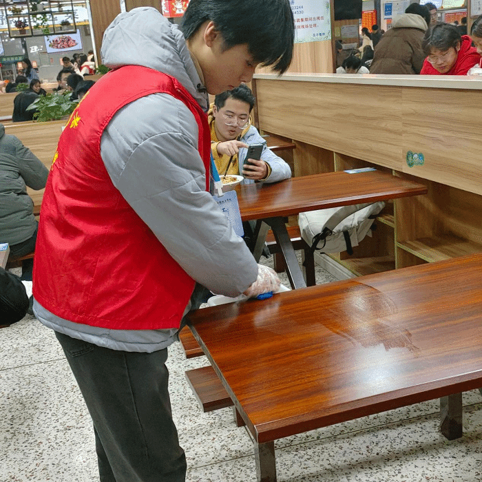 12月5日下午,志愿者们根据人员安排按时到提前联系好的一期一楼食堂进行清洁工作。小组内进行分工合作,不同的人负责不同的区域,有着不同的任务,活动中有人负责用抹布将桌椅板凳擦拭干净,有人负责换水清洗抹布,有人负责扫地和拖地……整个活动井井有条。