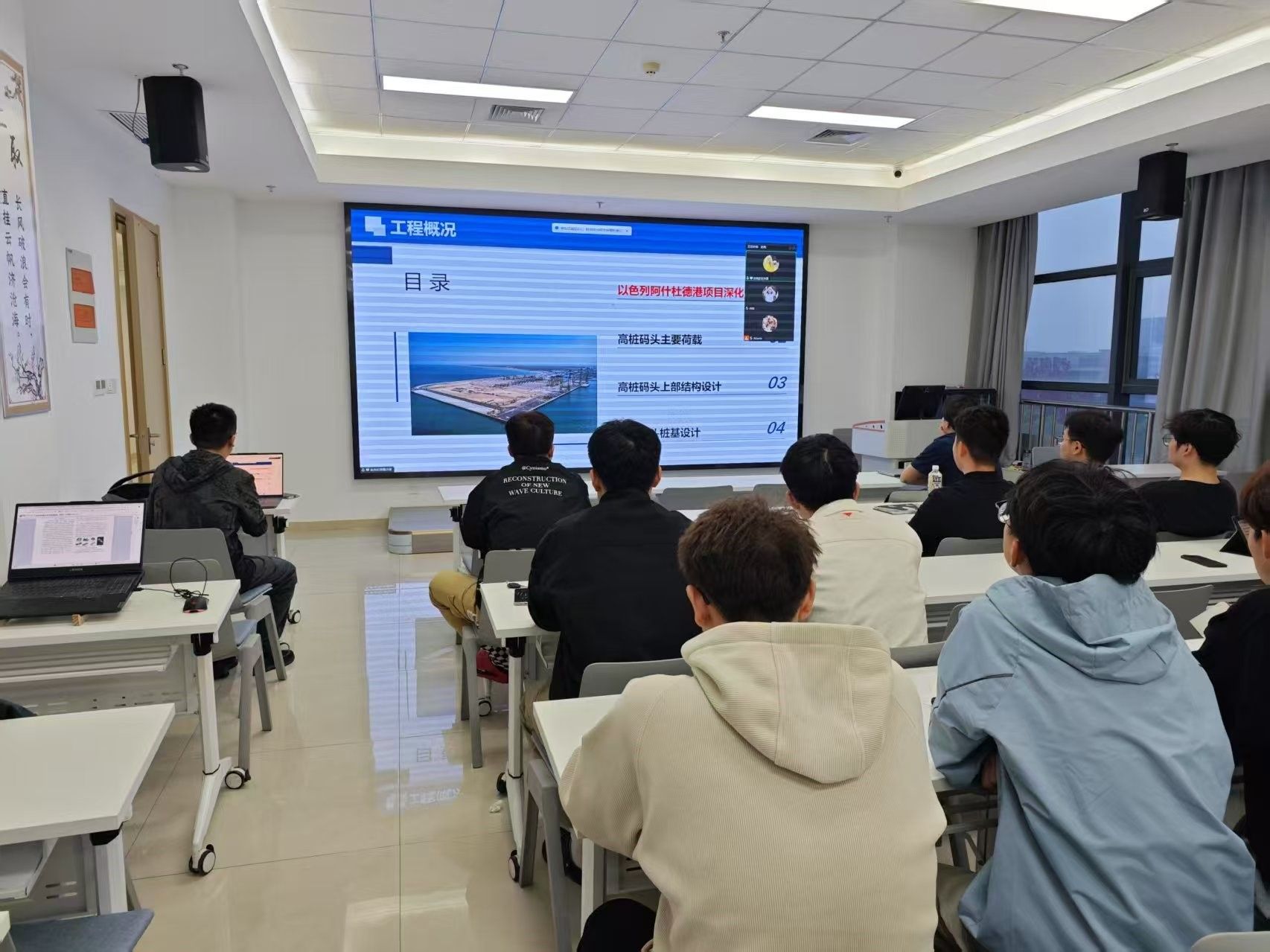 5月15日,土木工程学院邀请武汉现代物流研究院有限公司史尧高级工程师作题为“高桩码头结构设计要点”的专题讲座,分享行业关键知识与前沿技术。讲座由土木工程学院赵乙丁老师主持,部分研究生导师及全体2024级土木水利研究生参加。史尧以极具代表性的以色列阿什杜德港项目为切入点,介绍了项目面临的结构形式复杂、设计协调难度高、施工区域波浪与地质条件恶劣等诸多挑战,以及项目团队针对这些难题进行了一系列设计技术创新。随后,史尧深入讲解高桩码头设计的专业知识体系,包括荷载类型与计算标准、上部结构设计要点、桩基选型与布置原则等内容,搭建完整知识框架。