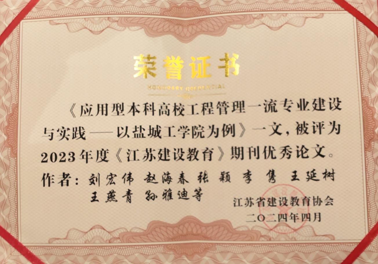 本次会议由协会秘书长成宁代表理事会汇报省建设教育协会2023年工作总结,由省建设教育协会副理事长高峰、沈士德、吴光林宣读了理事会相关决议与表彰文件,并分批上台接受表彰。我校获评2023年度“优秀会员单位”,刘宏伟教授撰写的论文“应用型本科高校工程管理一流专业建设与实践——以盐城工学院为例”获评2023年度《江苏建设教育》期刊优秀论文,并获评2023年度“江苏省建设教育工作先进个人”。