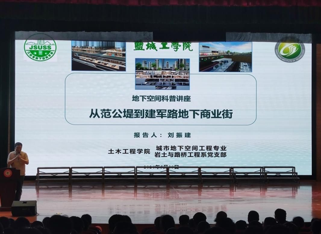 活动由盐城市新洋第二实验学校校长祝成荣主持。我院城市地下空间工程专业刘振建博士为该校360余名七年级学生作了主题为《从范公堤到建军路地下商业街》的科普讲座。讲座中,刘博士从范仲淹撒糠打桩定堤址,介绍了范公堤与海岸线变迁的故事,讲述了建军路地下商业街与盐城城市建设,分享了国内外地下空间典型工程案例和新技术,生动精彩的讲座开拓了学生的视野,赢得同学们阵阵掌声。此外,刘博士还介绍了钱七虎院士在地下空间方面的先进事迹,鼓励学生好好学习、勤勉笃实、科教报国。