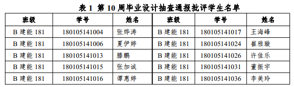下列同学(表1所示)在本周抽查中,毕业设计进度偏慢,特予以通报批评。