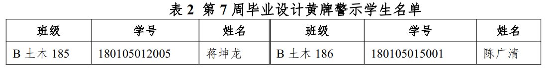 下列同学(表2所示)在本周抽查中,毕业设计进度显著滞后,特予以毕业设计黄牌警示1次。