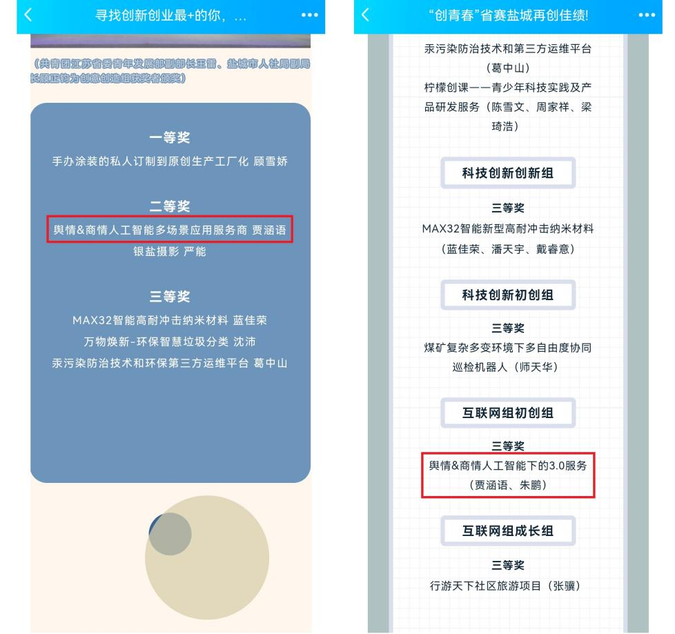 近日,第十二届“创青春”盐城青年创新创业大赛总决赛举行,我校土木工程学院贾涵语同学领衔的“舆情&商情人工智能多场景应用服务商”项目获大赛二等奖,朱鹏同学入选盐城市首批“盐城青年创业学院”学员(全市共20人)。贾涵语和朱鹏完成的“舆情&商情人工智能下的3.0服务”在第四届“江苏青年双创英才”青享会暨“创青春”江苏青年创新创业大赛中获三等奖。