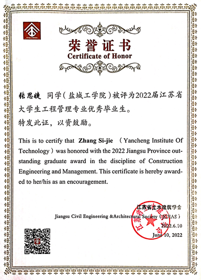 近日,从江苏省土木建筑学会传来喜讯,我院2022届本科毕业生张思婕同学荣获“江苏省大学生工程管理专业优秀毕业生”称号。