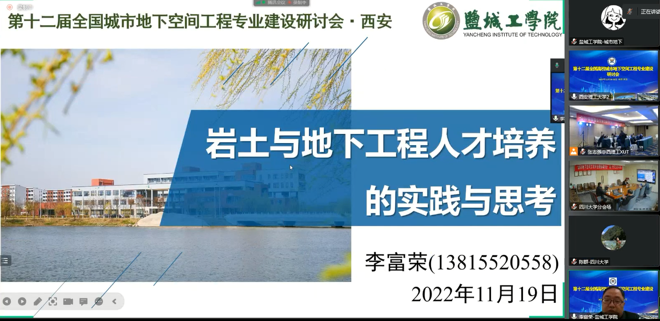 本次研讨会以“积极响应双碳战略,持续推进城市地下空间工程专业建设”为主题,邀请中国工程院陈湘生院士、全国勘察大师陈志龙教授等行业知名专家与学者作了主旨报告。会议围绕双碳战略下城市地下空间工程发展的现状与趋势、专业与课程体系建设、实践教学体系改革、主干课程教学改革等议题开展研讨。学院副院长李富荣教授代表我校作“岩土与地下工程人才培养的实践与思考”主题报告,介绍我校城市地下空间工程专业人才培养的做法与成效。