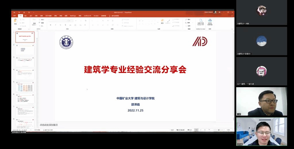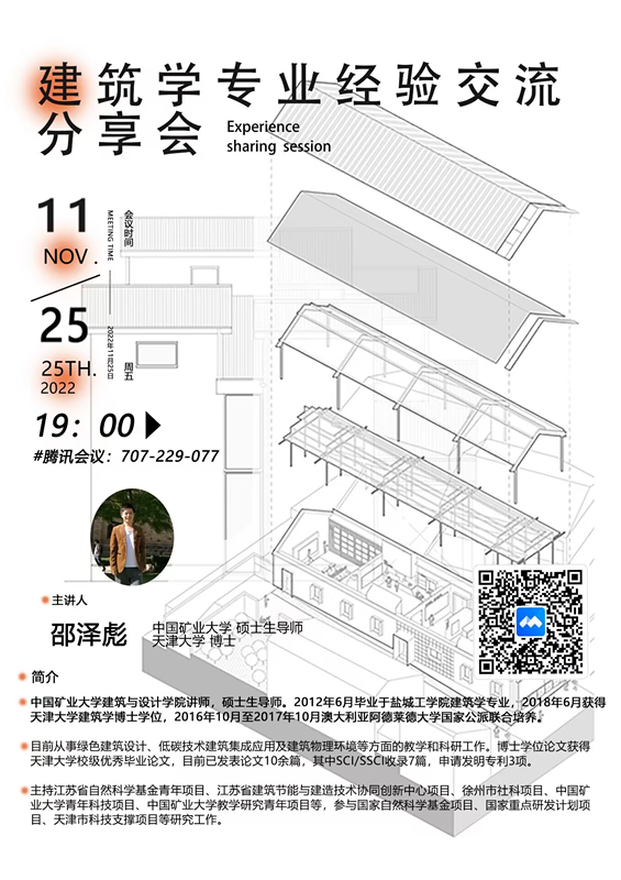 2022年11月25日,建筑学专业邀请中国矿业大学建筑与设计学院硕士生导师邵泽彪老师作经验交流线上讲座。讲座由建筑系主任王进教授主持,建筑学专业全体学生参加交流活动。