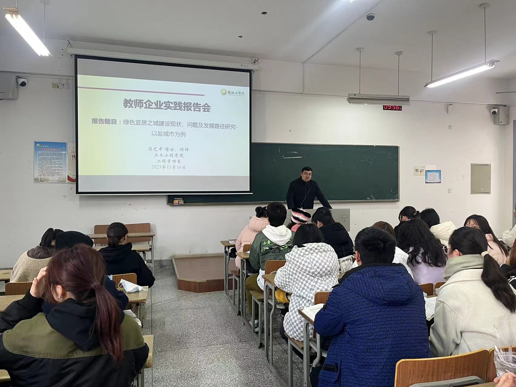 11月15日,工程管理系陈艺中老师以专业课程教学为背景,结合自己在企业的实践经历在博学楼B306为B工管211、212班级的学生做了题目为“绿色宜居之城建设现状、问题及发展路径研究-以盐城市为例”的实践报告。