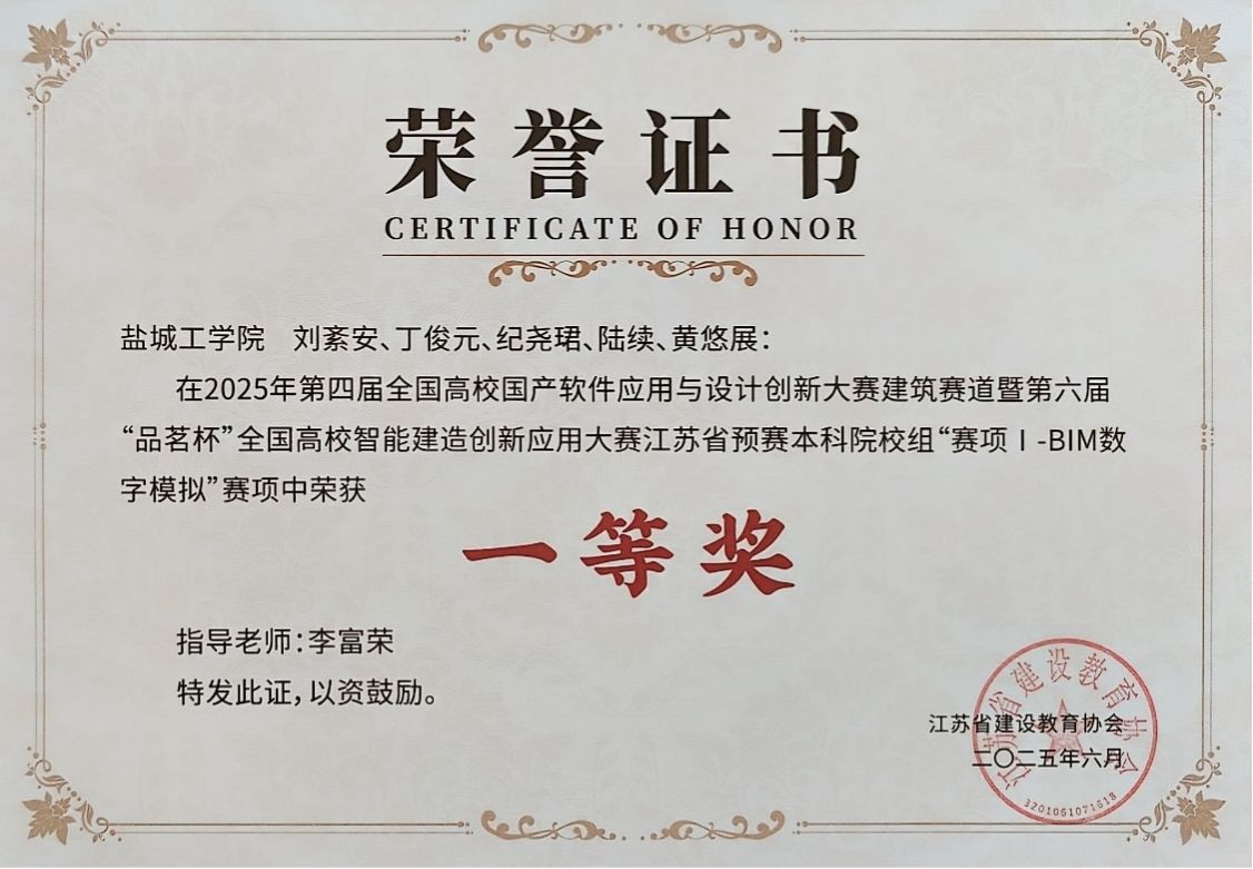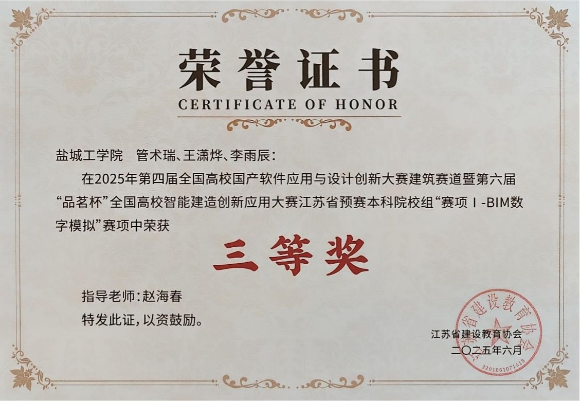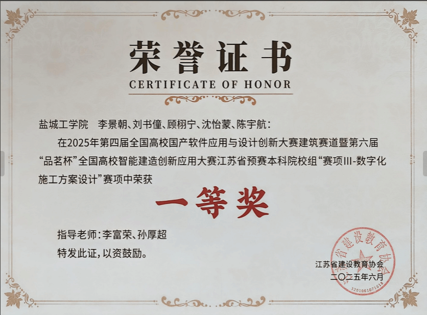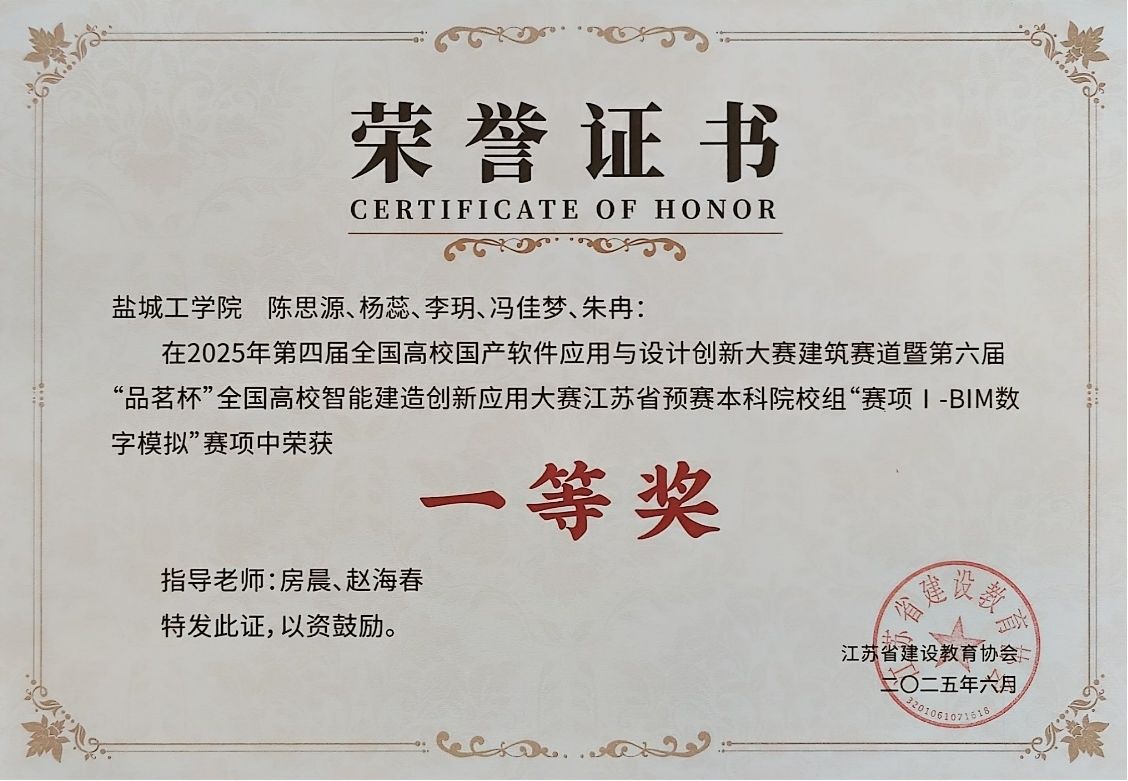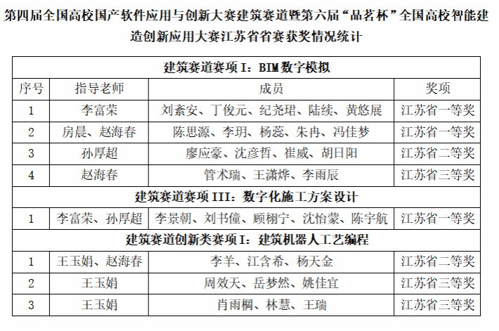 近日,江苏省建设教育协会公布了第四届全国高校国产软件应用与创新大赛建筑赛道暨第六届“品茗杯”全国高校智能建造创新应用大赛江苏省省赛结果,土木工程学院积极组织队伍参赛,分别获江苏省一等奖3项、二等奖2项、三等奖3项。