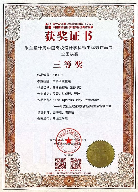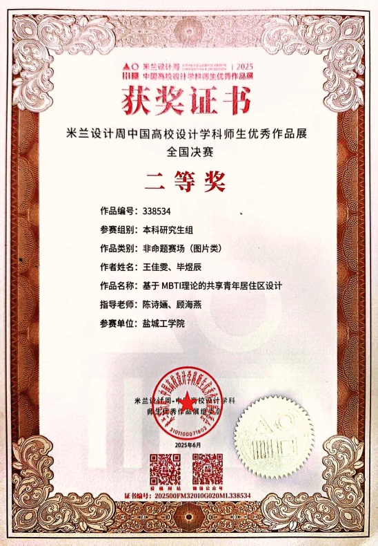 通过省赛选拔、国赛专家评审,王佳雯、毕煜辰同学的作品《基于MBTI理论的共享青年居住区设计》(指导教师:陈诗婳、顾海燕)荣获全国决赛二等奖;罗青、林成毅、吴迪同学的作品《“Live Upstairs, Play Downstairs”——开放社区理论赋能的全龄生活智慧住区》(指导教师:顾海燕、陈诗婳)荣获全国决赛三等奖。