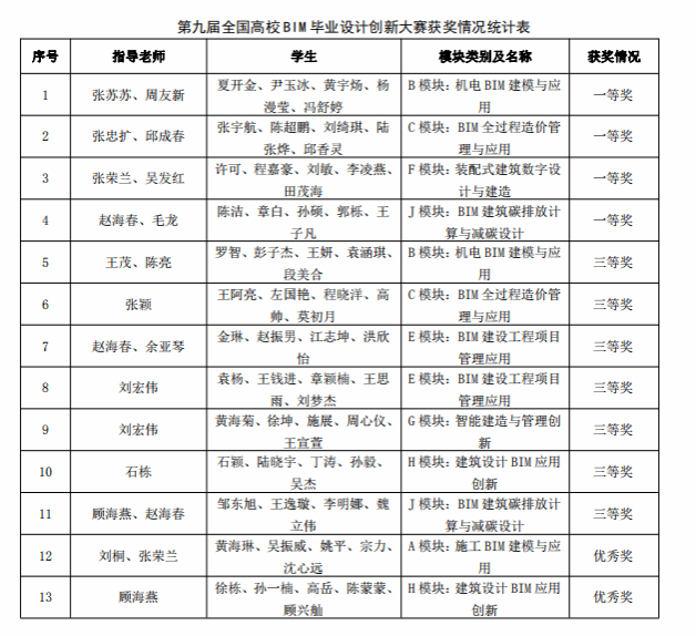 近日,第九届全国高校BIM毕业设计创新大赛组委会公布了BIM毕业设计创新大赛的获奖名单。土木学院共派出18支队伍参加全国BIM毕业设计创新大赛,获一等奖4项、三等奖7项、优秀奖2项。其中,张荣兰、吴发红老师指导的盐铁智建队,张忠扩老师指导的砼心协力造价队,张苏苏、周友新老师指导的畅通无阻队,赵海春、毛龙老师指导的盐城工学院队获大赛一等奖。