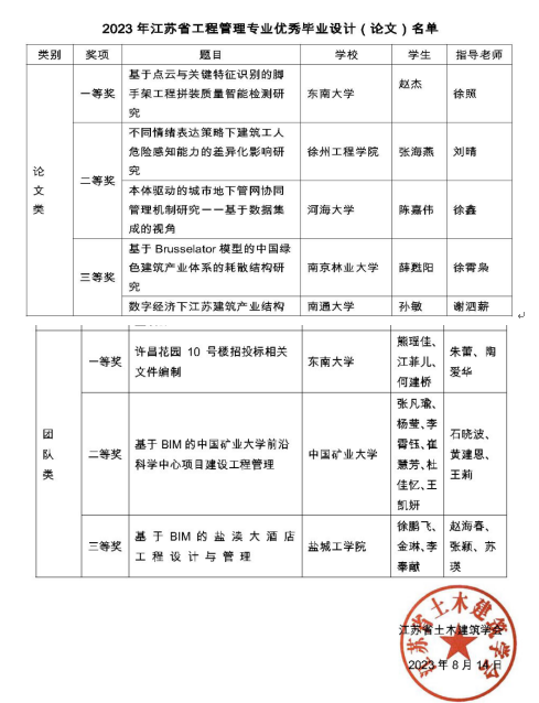 江苏省土木建筑学会在2023年江苏省工程管理专业优秀毕业设计(论文)的过程中﹐共收到18所高校推荐的33份候选优秀毕业设计(论文)申报材料,经工程管理专业委员会、建筑与房地产经济专业委员会的主任委员及副主任委员进行分类网上评审﹐评选出16份获奖的优秀毕业设计(论文)。