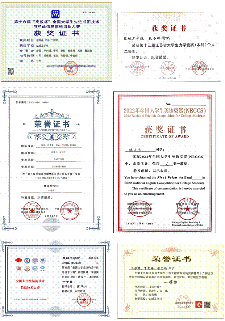 近几年,土木工程专业学子在在全国“互联网+”大学生创新创业大赛、“挑战杯”中国大学生创业计划竞赛、全国大学生结构设计大赛、全国大学生节能减排大赛、全国大学生先进成图技术与产品信息建模创新竞赛等国家和省级竞赛中获奖100余项。